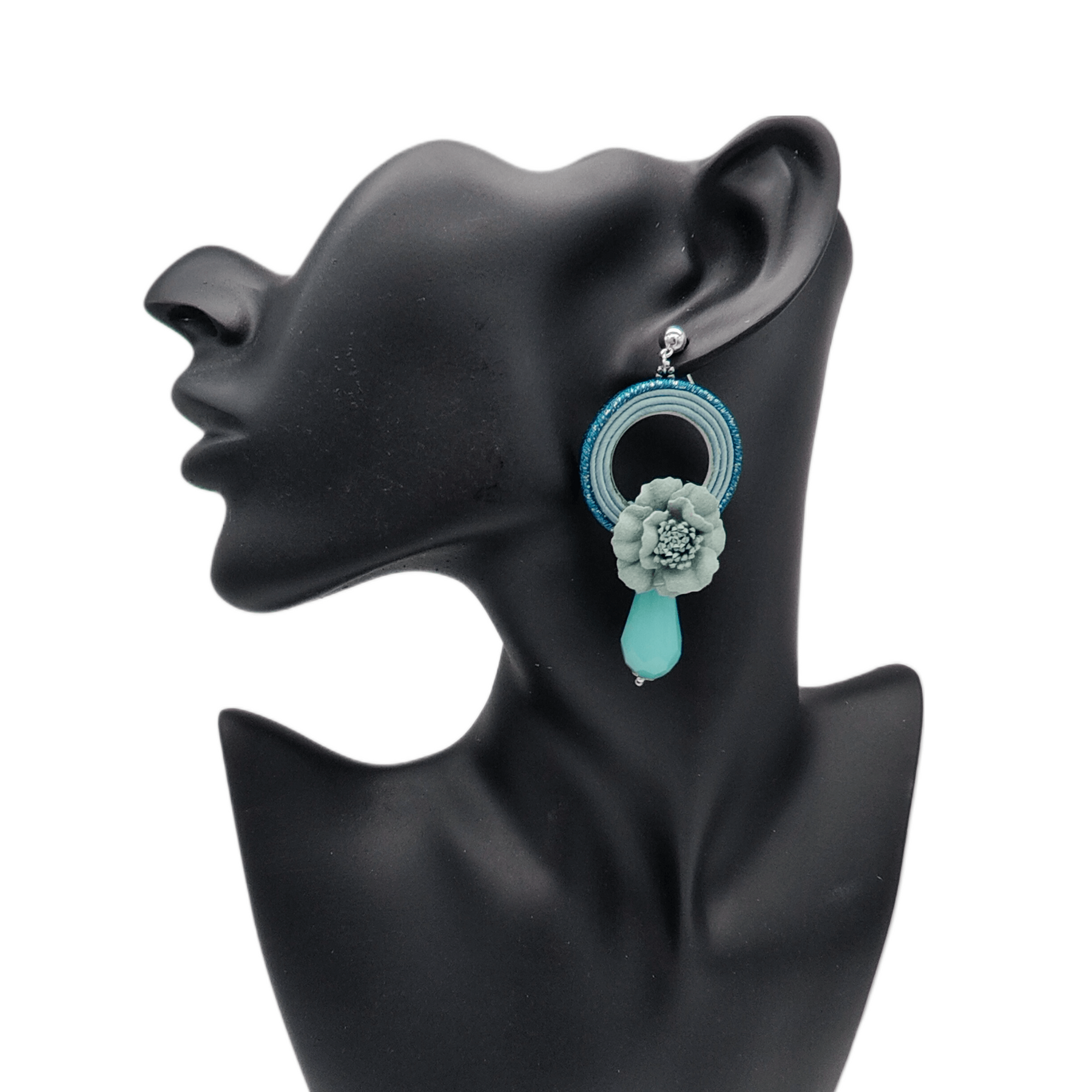 El soutache es una técnica artesanal de bordado que utiliza cordones finos y flexibles que se cosen alrededor de piedras, cristales (como Swarovski o checos) y perlas. Esto crea piezas con volumen, textura y colores vibrantes. El resultado son joyas únicas, ligeras y con un acabado muy elegante.